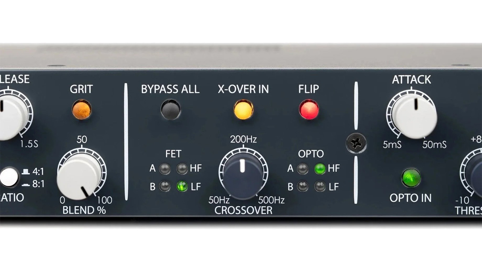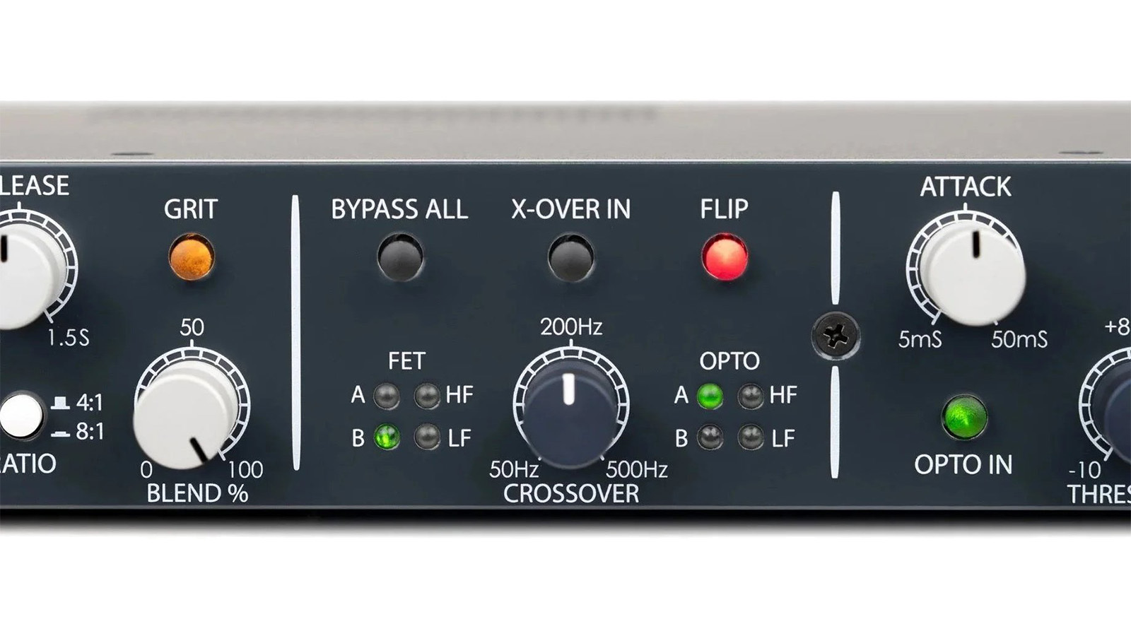 X-OVER IN を有効にすれば、OptoFET はデュアル・バンド・コンプレッサーにもなります。このボタンを押すと、クロスオーバー・フィルターと対応する CROSSOVER 可変周波数コントロールが有効になります。この時、各コンプレッサーは低域または高域のいずれかの周波数帯域に割り当てられ、両方の帯域を同時に独立処理することができます。CROSSOVER コントロールでは、クロスオーバーを適用する周波数帯域を 50 Hz から 500 Hz の範囲で正確に設定可能。FLIP ボタンはデュアル・バンド・モード時にも機能し、FET / OPTO を任意の周波数帯域に割り当てることができます。