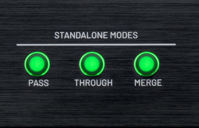 マージモードはスルーモードの逆で、全入力ポートが統合されMIDI出力1に送信されます。複数のコントローラーやシーケンサーを所有し、データを単一のマルチチャンネル音源やDAWに送信したい場合に最適な選択肢です。