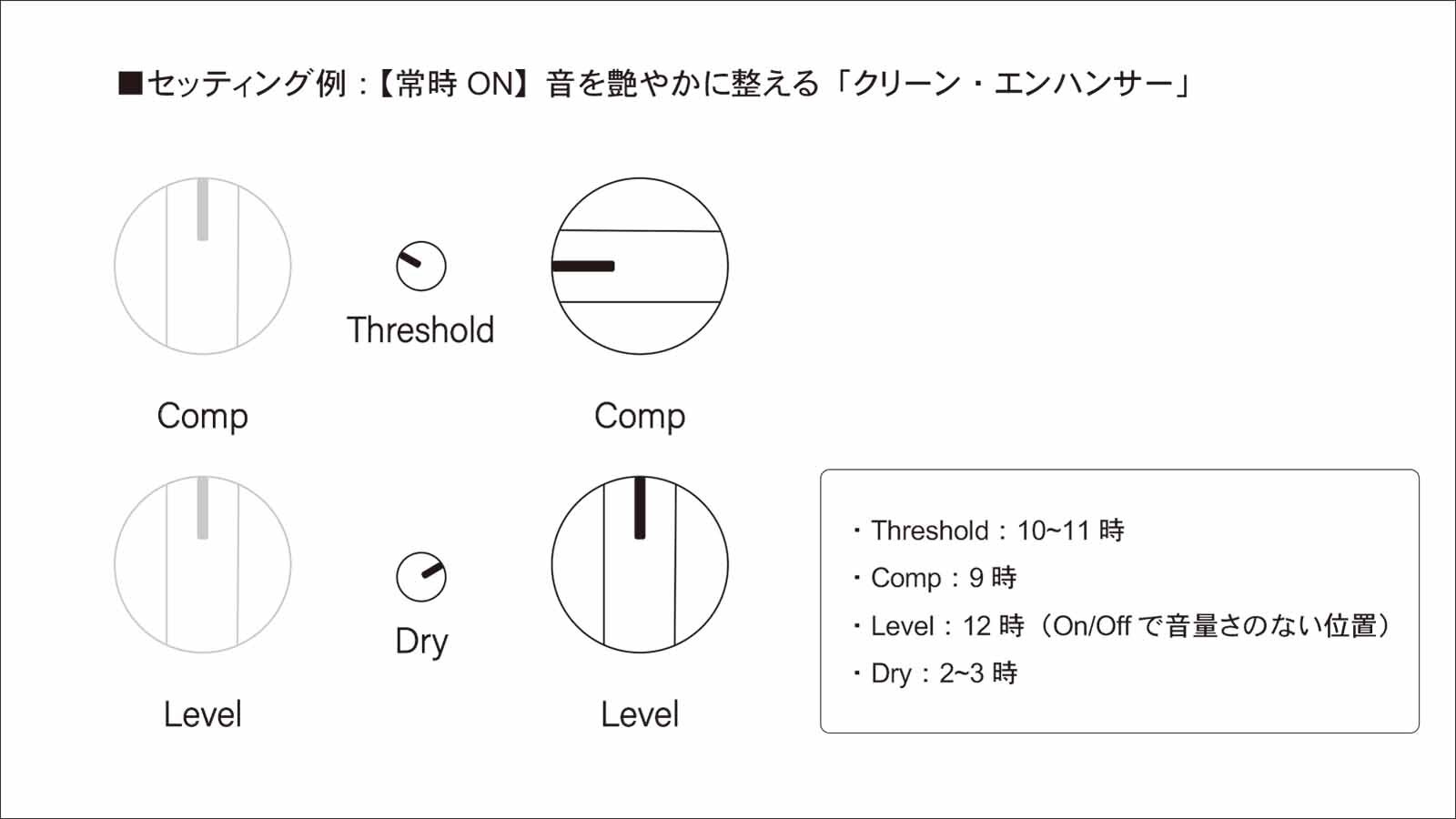 音を圧縮するのではなく、音の密度を上げて「リッチな響き」にする設定です。