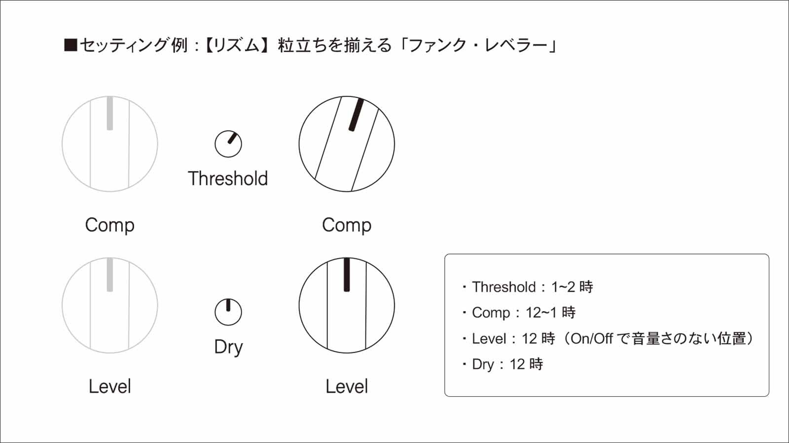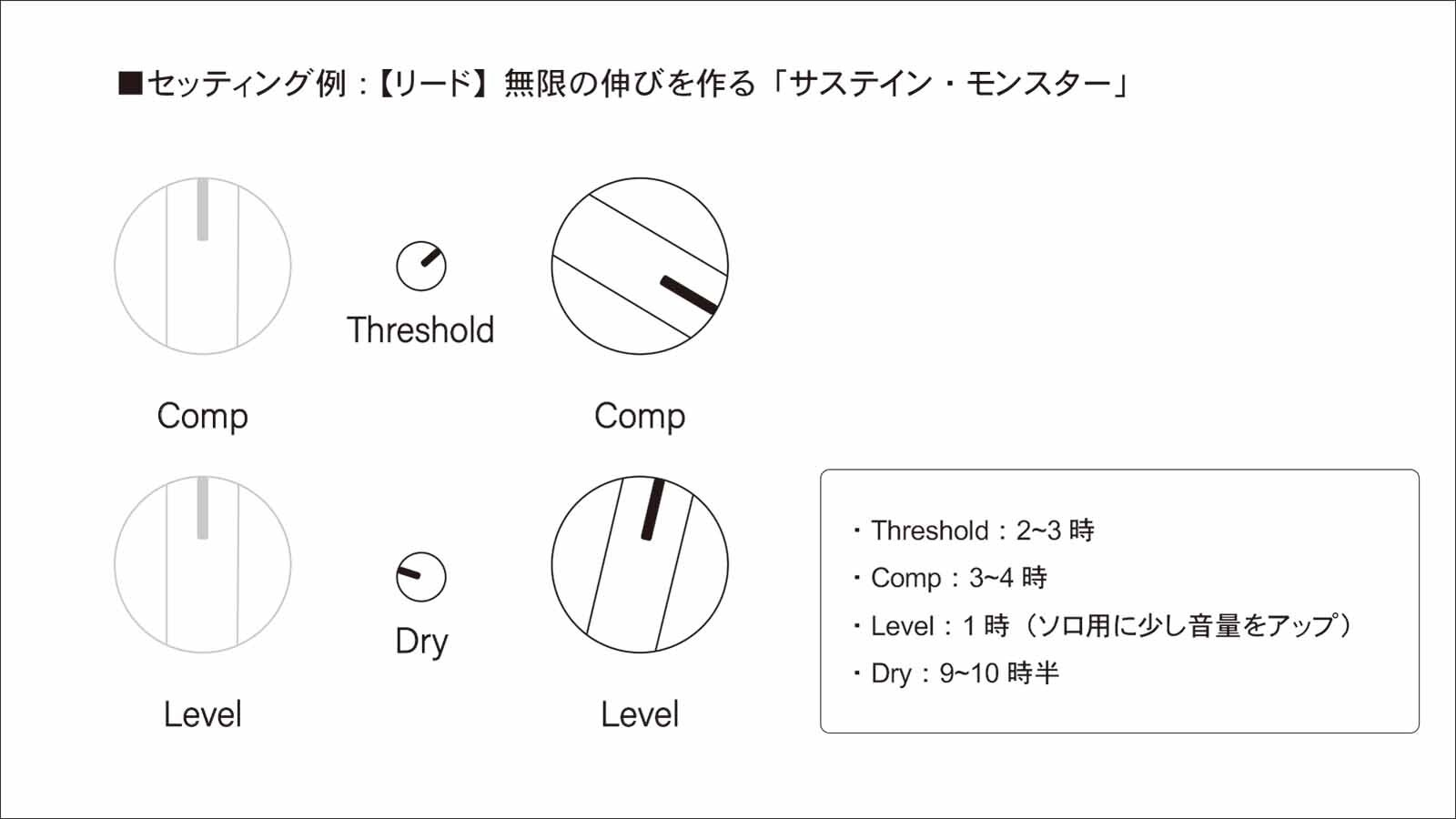 DRYノブで原音をミックスすることができます。原音を混ぜることによって、コンプ特有の「潰れた感じ」を抑えつつ、ピッキングの鋭いアタックを残したまま音に密度と太さを与えます。