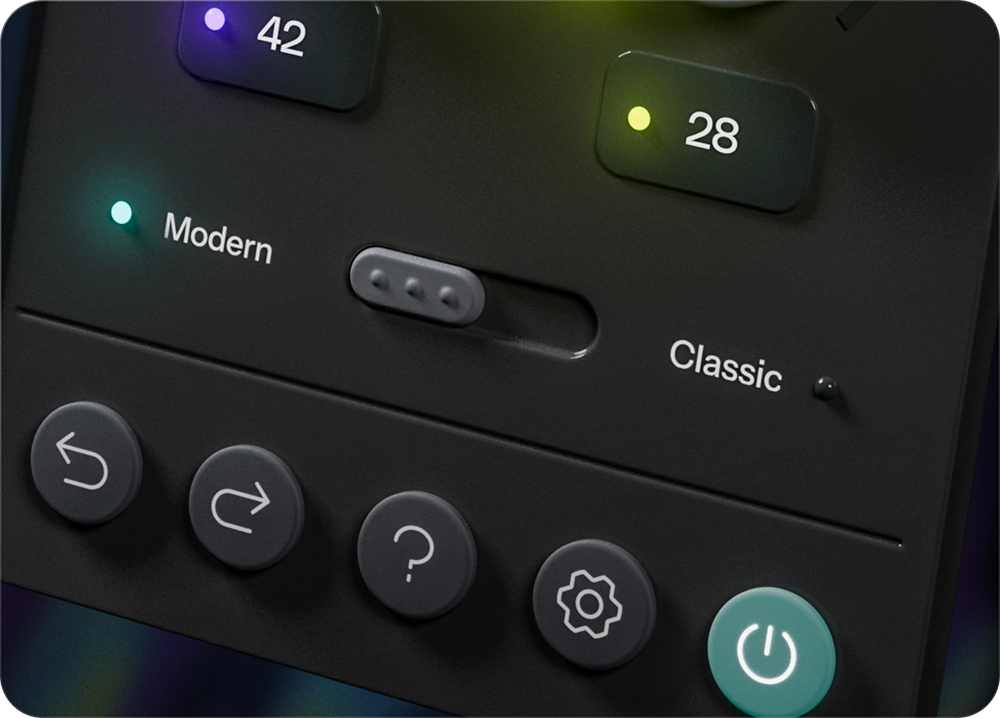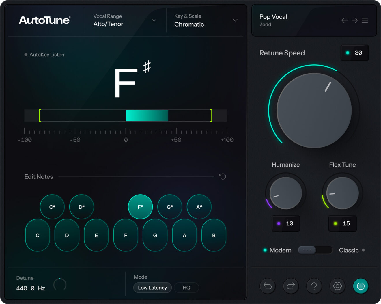 クラシックモードを選択すると、AutoTune 5 の昔ながらの雰囲気を再現し、何十年にもわたってポピュラーミュージックを席巻してきた象徴的な「AutoTune エフェクト」を実現します。モダンモードでは、Flex Tune と HQ モードが解除され、ボーカルをより細かくコントロールできます。