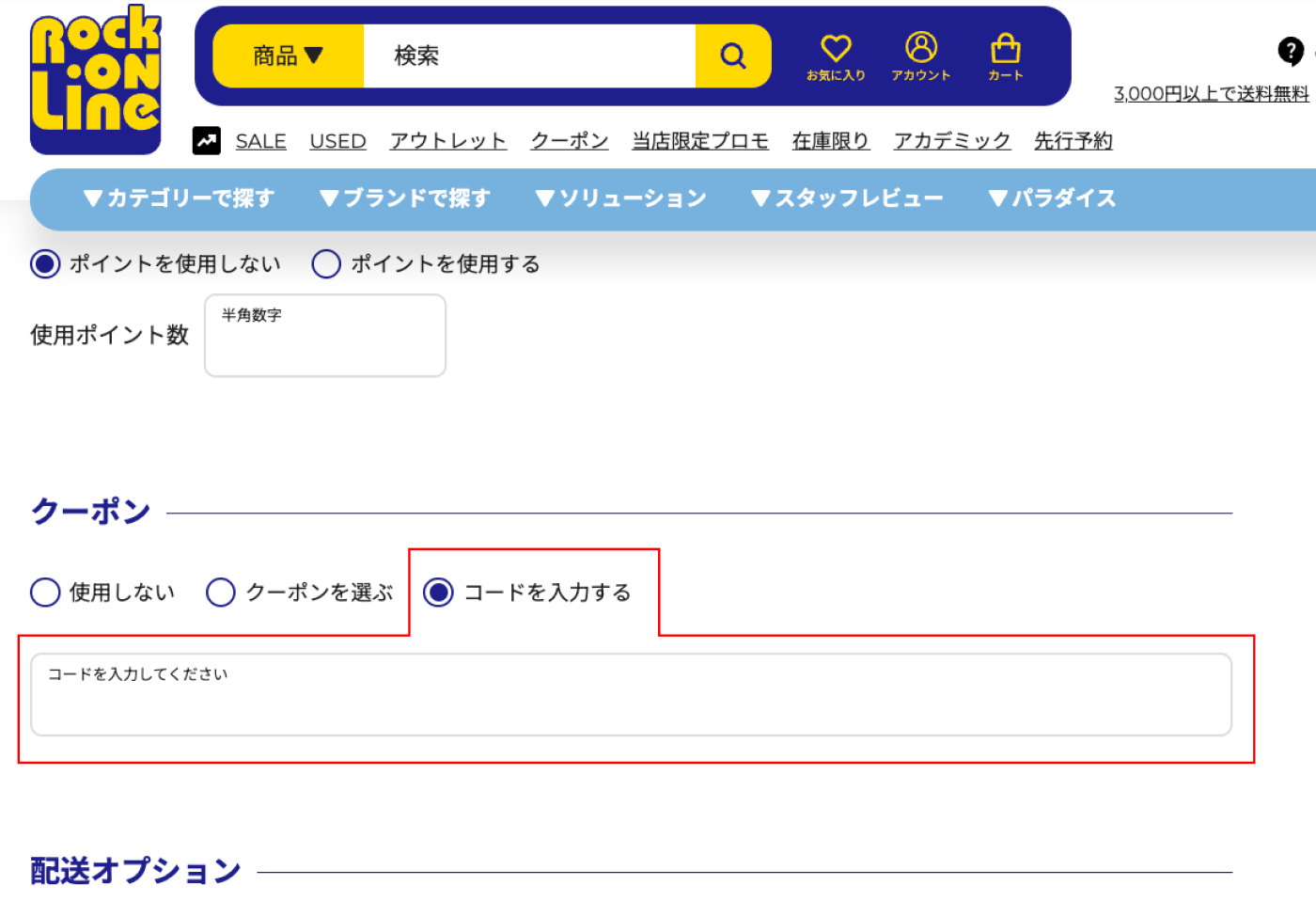 eStore会員としてログインを行い、チェックアウト画面にて、「コードを入力する」を選択、LINE初回あいさつメッセージ内のクーポンコードをご入力ください。※クーポンコードのご利用にはeStore会員としてログインが必要となります