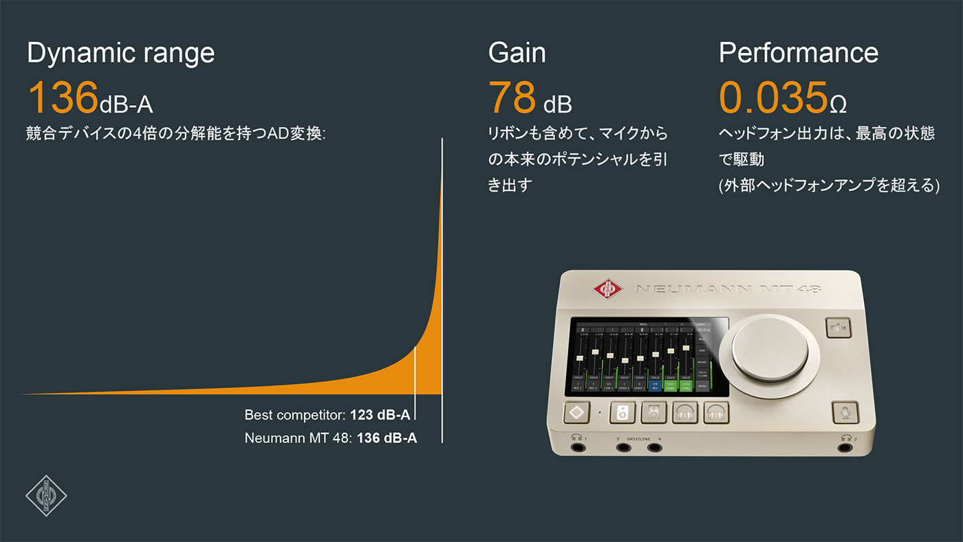 MT 48はKHシリーズのスタジオモニターおよびNeumannヘッドホンにも最適な、Neumannマイクロホンのフルダイナミックレンジを捉えるクラス初のオーディオインターフェイスです。
