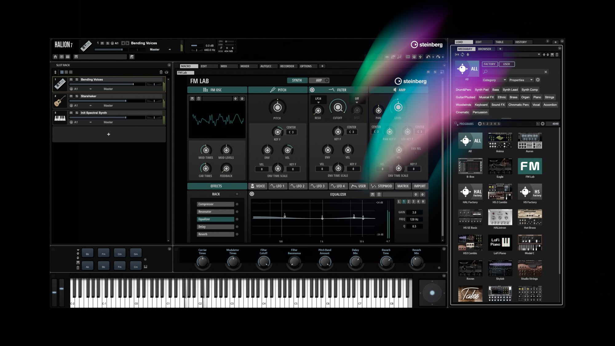 HALion 7 はシンセゾーンに新しい FM エンジンを搭載しました。シンセ史を代表する FM シンセサイザーを数多く生み出したYAMAHAとの共同開発によるこのエンジンは、最大8つのオペレーターを自由に組み合わせ、キャリアとしてもフィードバックループを組むことも可能です。