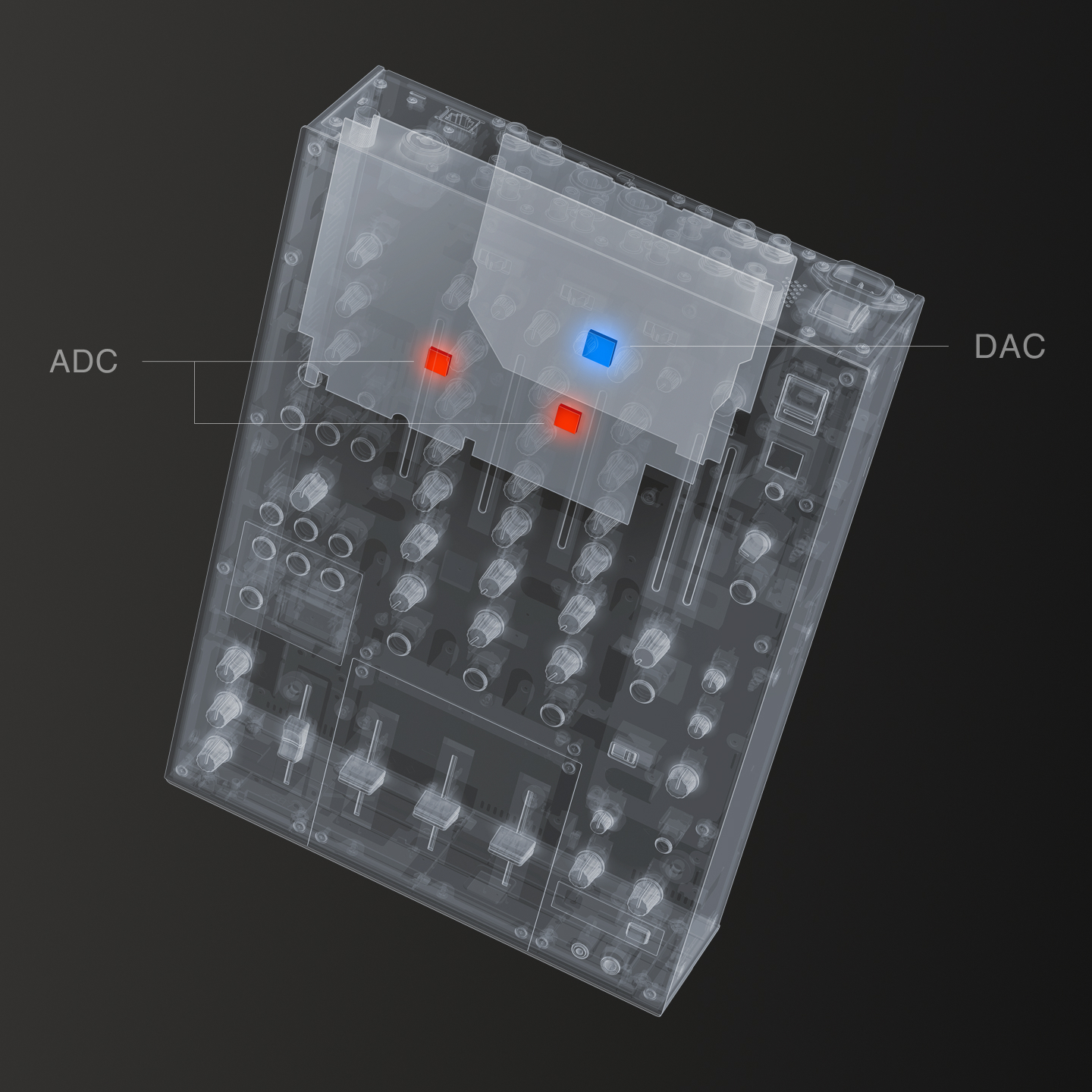 スタジオクオリティの96 kHz/ 64 bitミキシングDSP処理を採用し、チャンネル入力部とMASTER出力部にはESS Technology社製の32bit高音質A/D、D/Aコンバーターを搭載。さらに、各音質パーツの選定と最適化を行い、クラブなどの実際の使用環境での試聴テストを繰り返すことで、音質を丁寧に磨き上げました。音の輪郭や空間表現、音と音の余白まで繊細に表現し、臨場感あふれるサウンドにより、各音源が明瞭に際立ち、心地よく踊れる音楽体験を提供します。