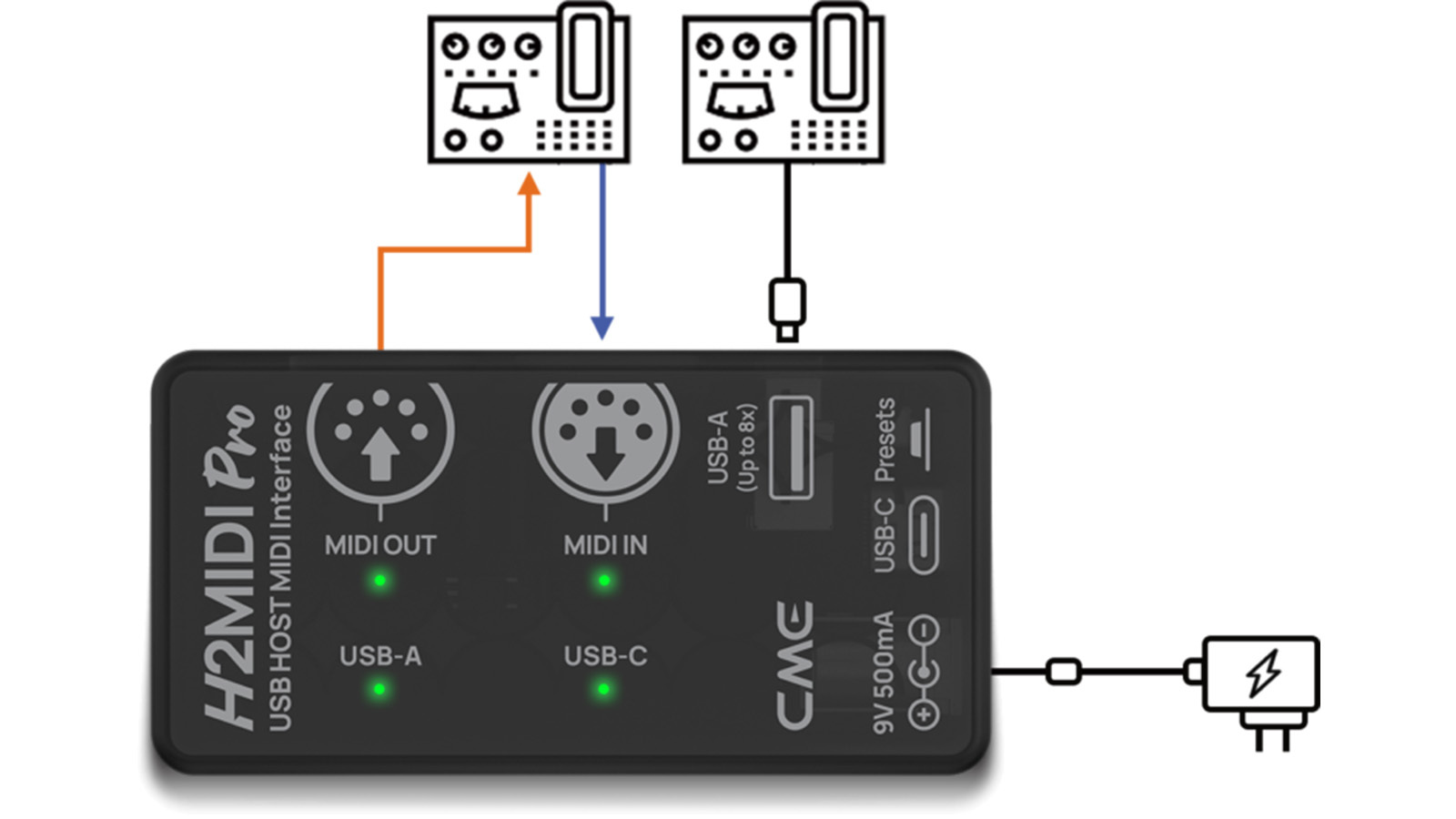USB MIDI キーボード、コントローラー、その他のデバイスを、コンピューターを介さずに従来の MIDI ハードウェアにシームレスに接続できます。デジタルピアノ、ドラムマシン、ポータブルキーボード、ギターペダル、EWI、シンセサイザーなど、USB クラス準拠の MIDI 機器と互換性があります。