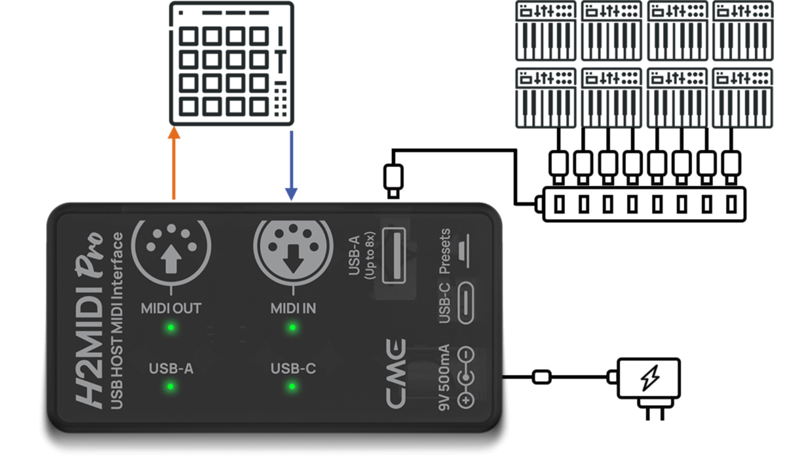 USB ハブを介して最大8台の USB MIDI デバイスを接続でき、複雑なセットアップにも柔軟に対応します。5ピン DIN MIDI ポートを介した双方向の MIDI 通信は、MIDI ハードウェアとの接続に最適です。
