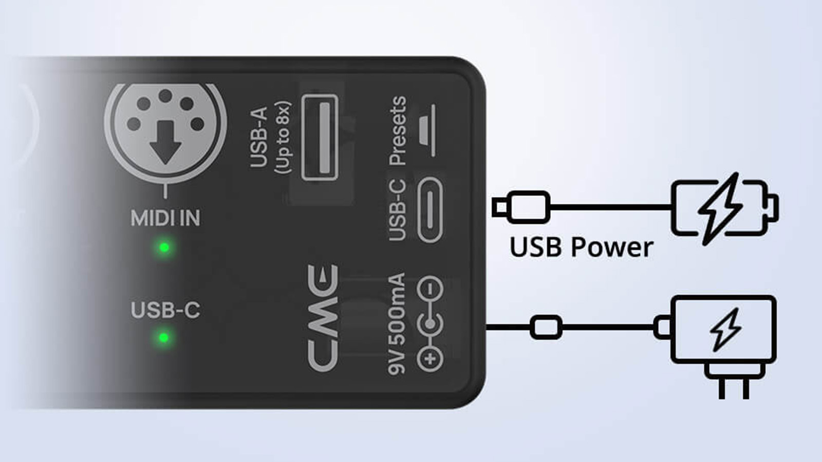 ギターペダル愛好家向けに、一般的な9V DC 電源にも対応。シームレスな連携をお楽しみください。