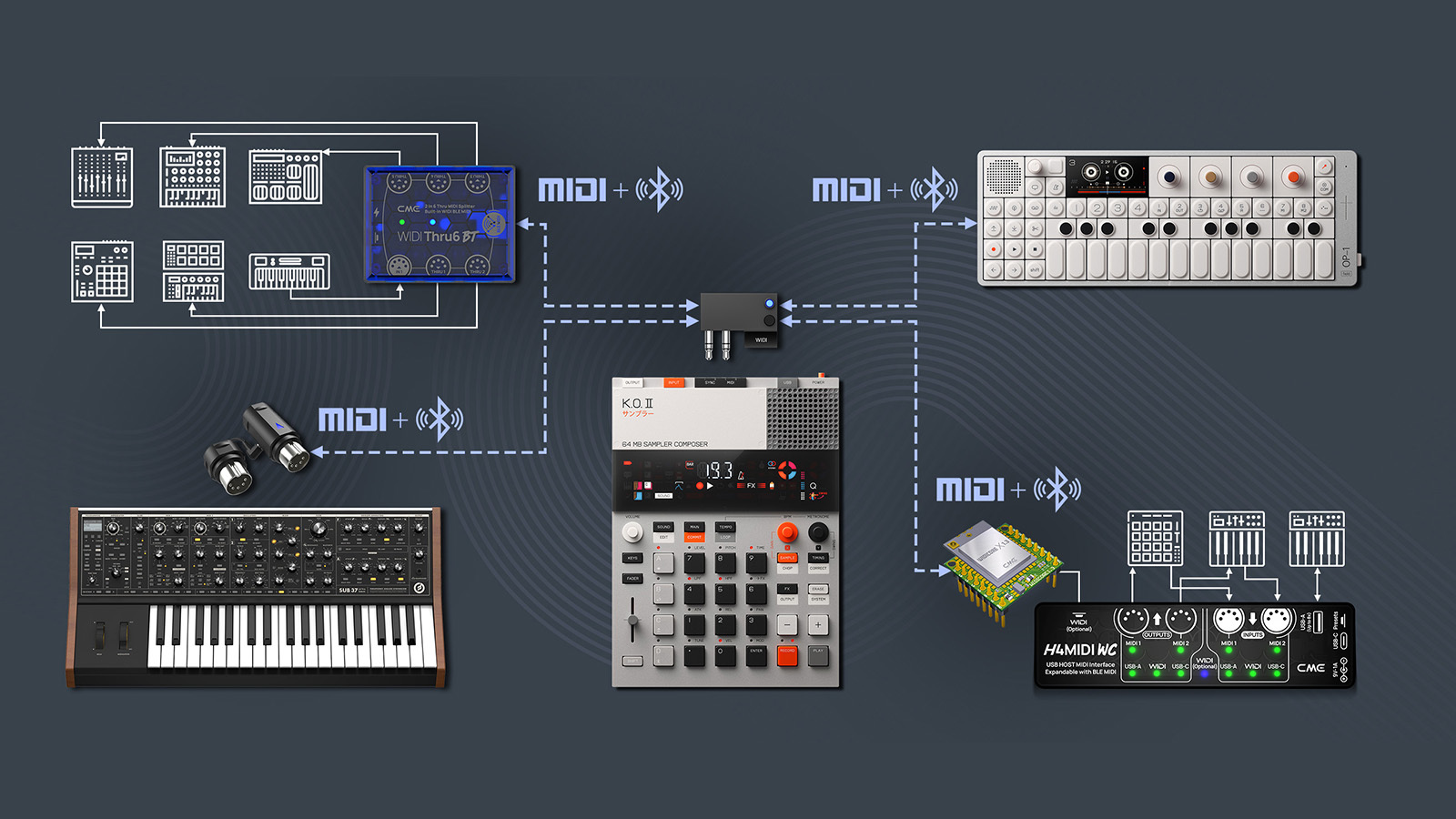 WIDI K.O.II は、 teenage engineering EP-133 (KO II)、EP-1320 (Medieval)、EP-40 (Riddim)のために開発されたBletooth MIDI/ワイヤレスMIDIユニットです。仮想 MIDI ケーブルとして機能し、ケーブル不要、コンピューター不要で、すべての MIDI デバイスを Bluetooth MIDI で接続できるようになりました。