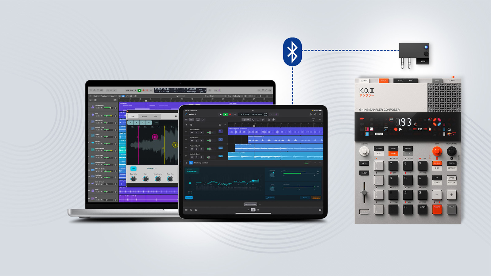 2台の WIDI デバイスを使って、teenage engineering K.O.II または medieval を他の MIDI ハードウェアに接続しましょう。K.O.II をシンセサイザーシステムの頭脳として活用しましょう。
