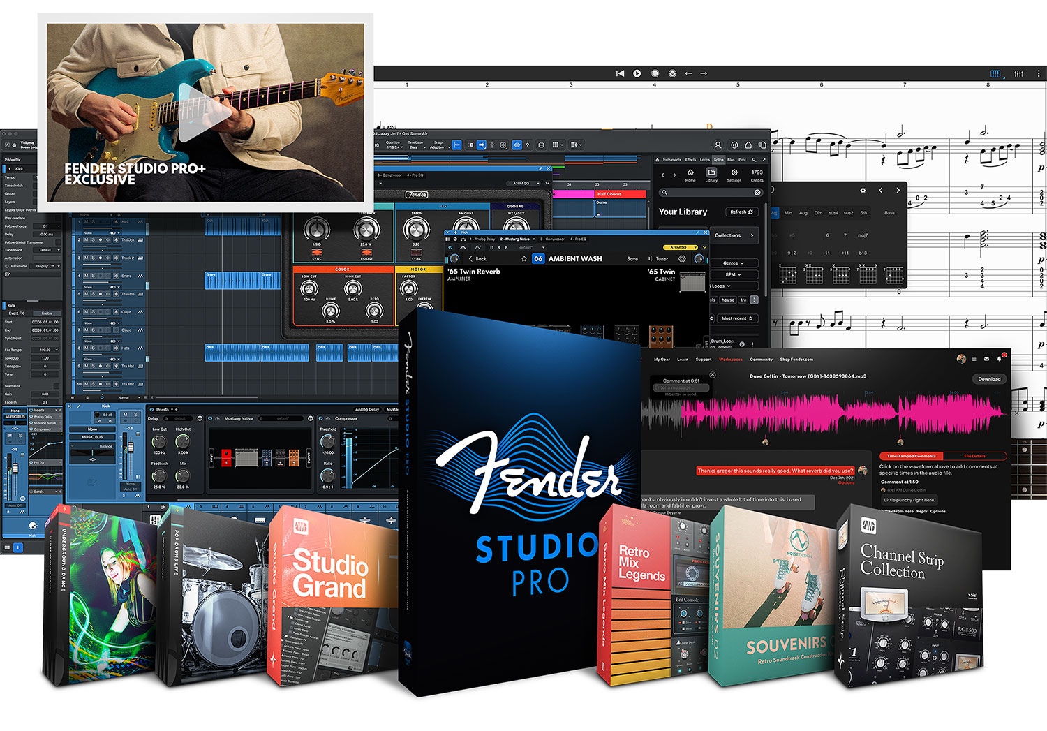 Fender Studio Proは、ドラッグ&ドロップによる流れるようなワークフローと、インスピレーションあふれるバーチャル・インストゥルメント、ネイティブ・プラグイン、オーセンティックなフェンダー・アンプ・モデルMustang GuitarとRumble Bassからなる完全なコレクションで、アイデアを素早く簡単に形にできます。