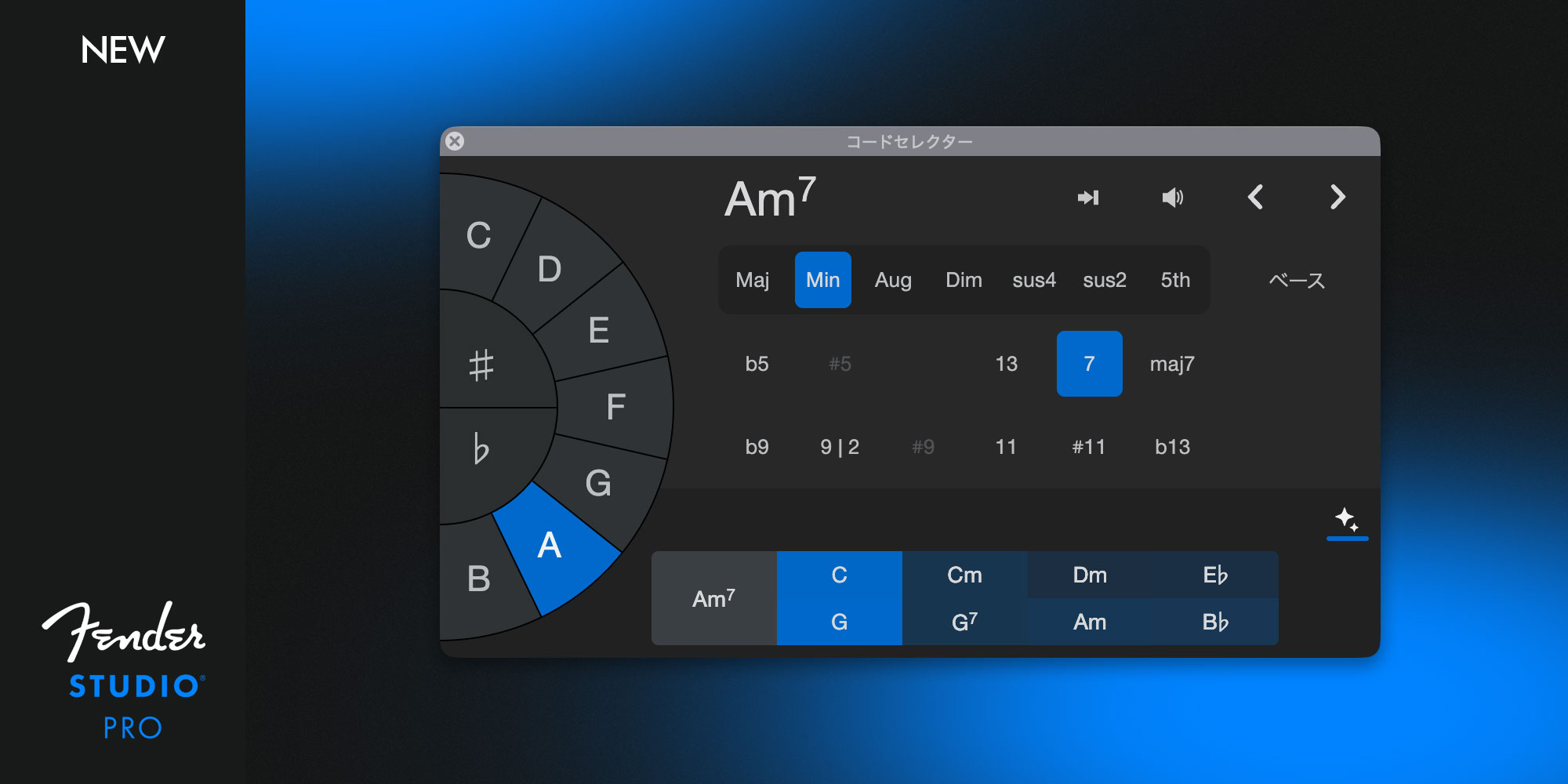 Fender Studio Proでは、コード・アシスタントが追加され、コード・トラックはさらにパワフルになりました。コード・アシスタントは、既存のコード進行に基づいてコードをレコメンド。既存のコードやコード進行の隣に新しいコードを追加するだけで、確率的モデルに基づいて何千ものコード進行から構築されたコードが割り当てられます。任意のコード・イベント上の矢印をクリックすると、コンテキストに基づいたおすすめのコードが表示されます。または、コードをダブルクリックするとコード・セレクターが表示されます。