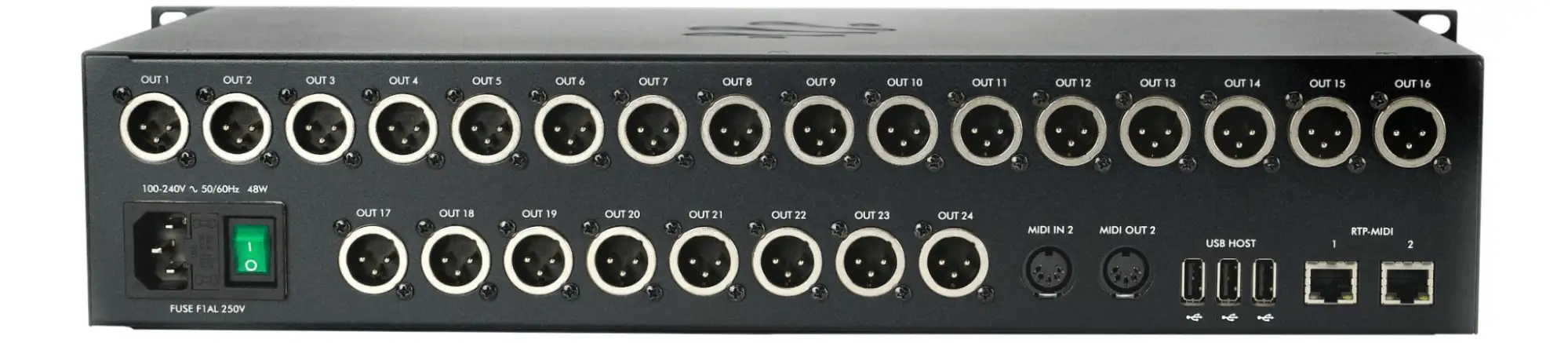 5ピンMIDI DIN、USB MIDIホスト、2系統のRTP MIDI対応イーサネットを備えた中核的なMIDIハブ兼コントロールセンターです。プログラム可能なポートやフロントボタンにMIDIコマンドを割り当て、本体から直接ショーを制御可能。高度なMIDIプロセシングにより、信号の送信先やタイミングを自在に設定し、プログラムチェンジの最適化や全ノートオフ送信、不要なCC除去などを行いながら、複雑なライブ環境でも高い信頼性を実現します。