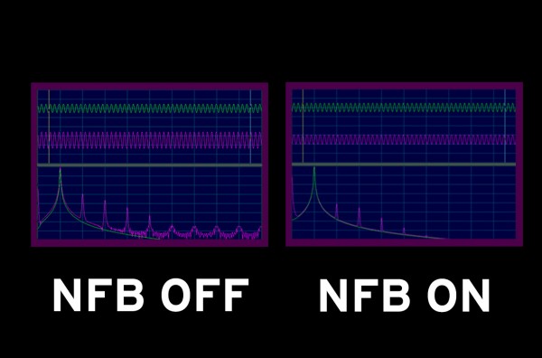 負帰還スイッチがOFFの時は、帰還のない回路になり、Nutube(三極管)の持つ倍音が増強され、より真空管色のつよい豊かなサウンドが生成されます。NFBスイッチをオンにすると歪み率と倍音が低減され、より「ハイファイ」なサウンドになります。