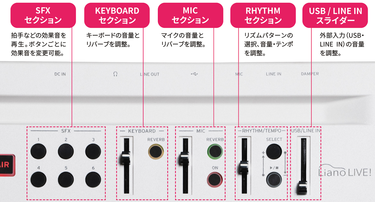 はじめてでも迷わない、シンプルな操作パネル。ワンタッチで全体の音をON / OFFできるON AIRボタンも搭載。配信中のアクシデントにも すばやく対応できます。 鍵盤とマイクにはリバーブを3段階で個別に設定可能。演奏にも歌声に も、それぞれちょうど良いリバーブを加えることができます。