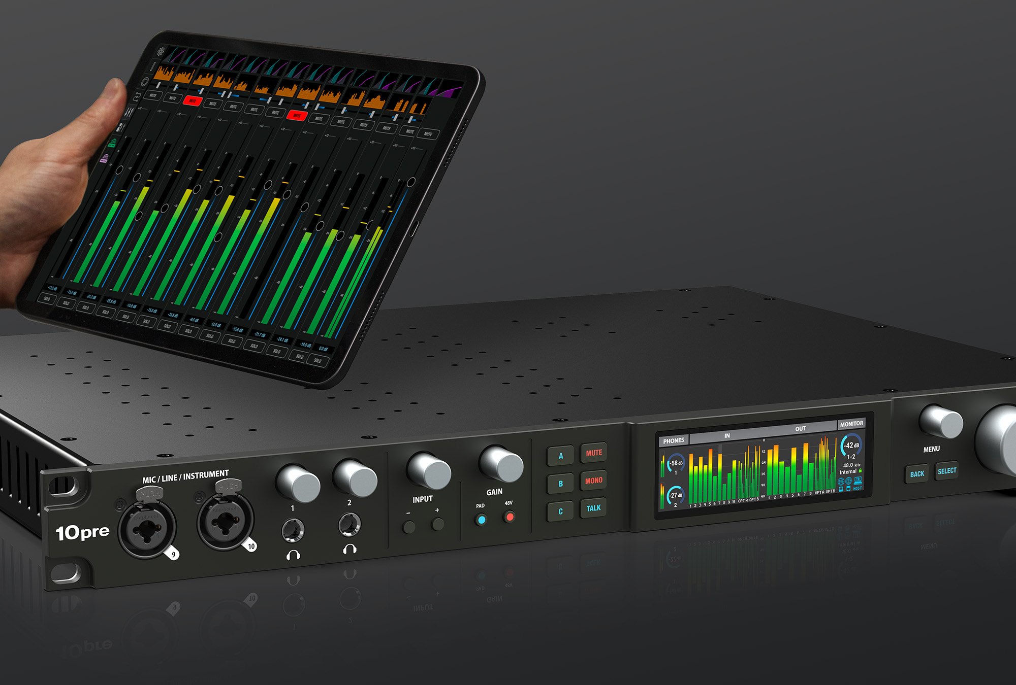 10preは大型ミキシングコンソールと同様の設計を採用した64チャンネルのデジタルミキサーを内蔵しています。64チャンネルの入力はあらゆる場所からの信号を受け付けます:10pre本体の物理入力、コンピューター上のホストソフトウェアからのオーディオチャンネル、オーディオネットワークストリーム、さらにはミキサー出力さえも。ミキサーは26のAUXバスに加え、メイン、リバーブ、モニター、ソロバスを提供します。全入力チャンネルおよび出力バスには、4バンドの倍精度パラメトリックEQとコンプレッサーが装備されています。さらに、入力チャンネルにはハイパスフィルターとゲートも搭載。これにより高性能かつ透明性の高いミキシングやモニターミックスを提供します。