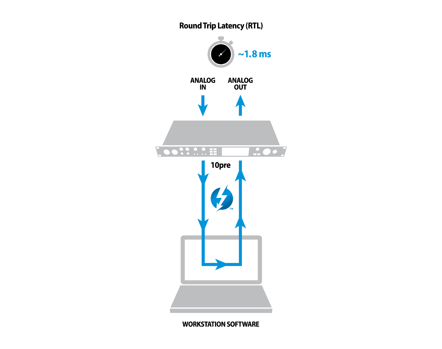 MacとPC両方の環境に対応した最適化されたドライバーにより、MOTU社定評の超低レイテンシー性能を実現。Digital Performerなどの高性能DAWを使用する場合、10preはThunderboltおよびUSB経由で96kHz、ホストバッファ32サンプル時において、驚異的な往復レイテンシー(RTL)約1.8ミリ秒を達成します。