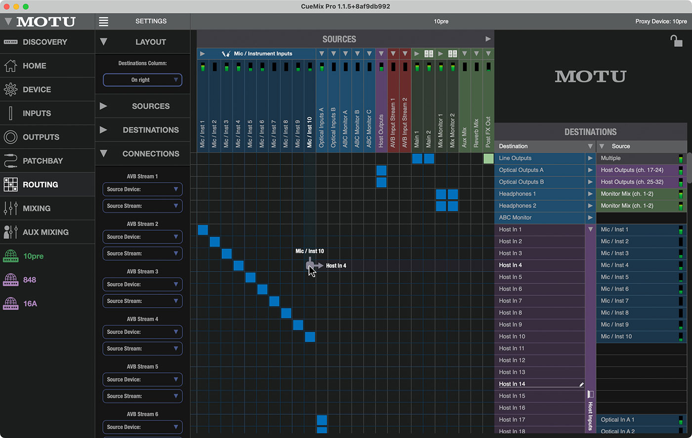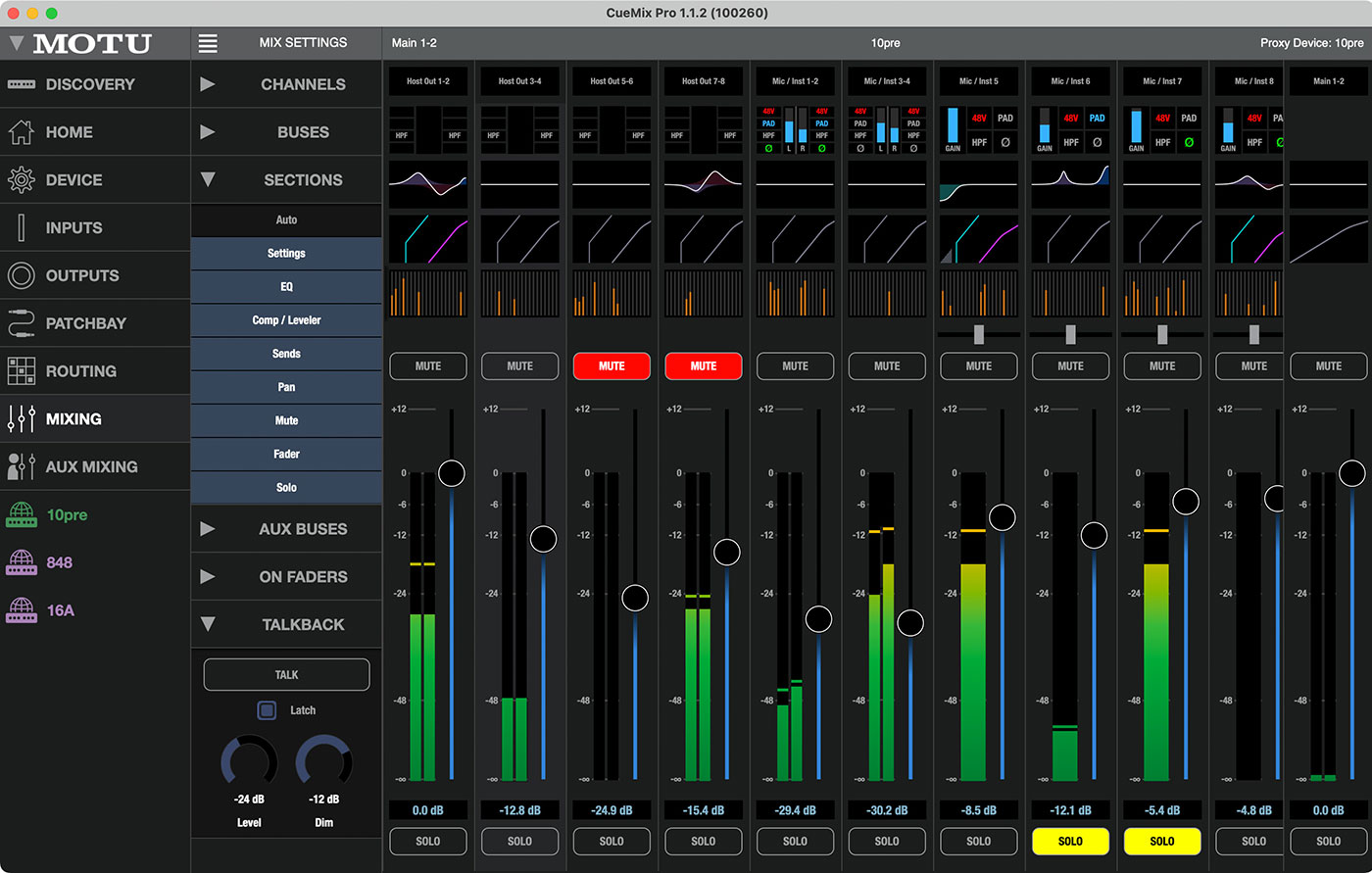 CueMix Proは、デバイス設定、信号のルーティング、64チャンネルのミキシングとエフェクトを含む、10preのあらゆる機能を制御するために開発された謹製アプリです。macOS、Windows、iOSに対応し、複数のデバイスで同時にCueMix Proを実行して、Wi-Fi経由で10preにワイヤレスでアクセスできます。1722.1コントローラーとして、CueMix Proはネットワーク上のサードパーティ製デバイスにおけるAVB関連設定へのアクセスにも使用できます。