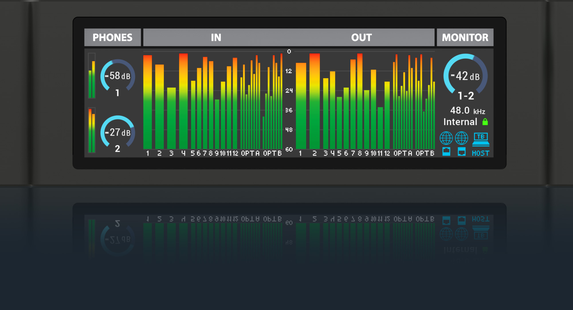10preは、Mac、PC、iOS向けに最先端のThunderbolt 4およびUSB4ユニバーサル接続を提供します。付属の40 Gbps USB-Cケーブルでホストデバイスを接続すると、10preは最大40 Gbpsの最高速度接続を自動調整し、Thunderbolt 3、USB3、USB2ホスト接続との下位互換性をも確保します。ThunderboltおよびUSB4接続は、最大96kHzのサンプリングレートで驚異的な256チャンネル(入力128チャンネル、出力128チャンネル)のコンピューターI/Oを実現します。