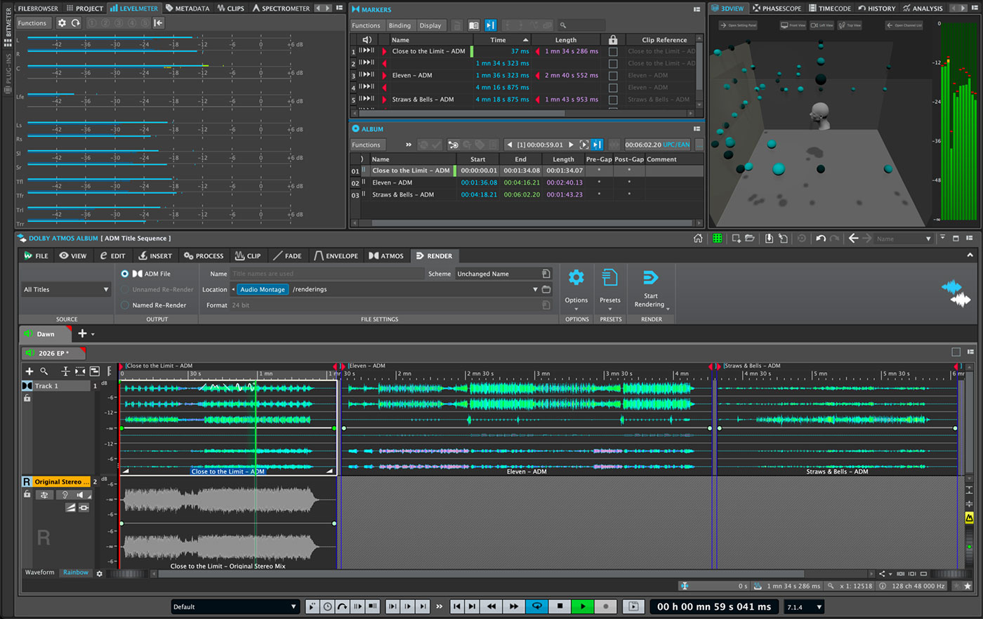 アルバムモンタージュでは、複数のADMファイルを一つの結合したアルバムマスターとして組み立てることができます。ファイルはステレオモンタージュとほぼ同様に、一つまたは複数のトラックに連続的配置可能です。クリップはステレオから 9.1.6 まで複数のフォーマットで表示でき、Dolby Atmos Renderer と揃えた自動更新にも対応します。