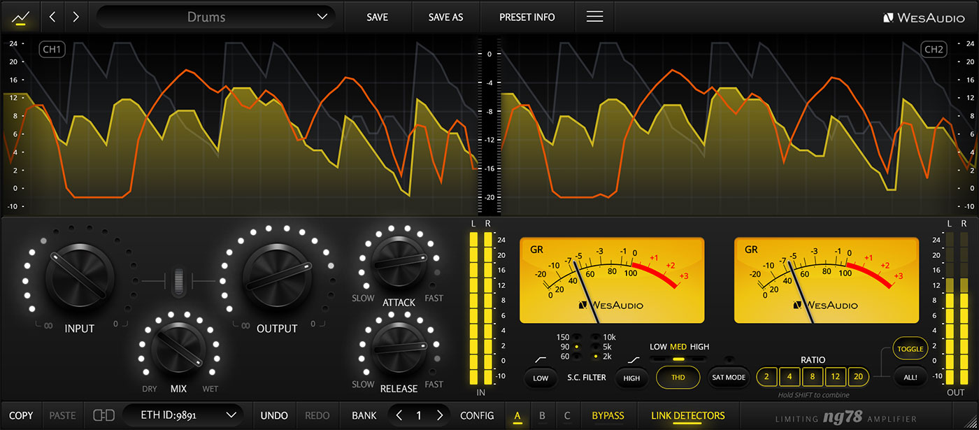 通常は最大800us程度のアタックタイムは、ng78では20msまで拡張。シャープでアグレッシブなコンプレッションだけでなく、よりナチュラルでスムースなコンプレッションも可能です。加えてRATIOには新たに2:1の設定も追加。サチュレーション量を調整できるTHDコントロールも備え、グルー効果を狙うようなオペレーションでもその価値を発揮することができます。