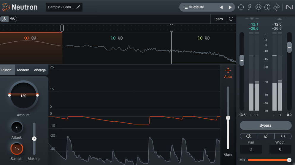 強く、エネルギッシュなトランジェントを保持することで、重み、ボディ感、インパクトを強調します。ドラムやベースなど、より強いアタックや物理的な存在感が欲しいソースに最適です。さらに明瞭な「パンチ感」を得たい場合は、オートゲインのレベルよりもわずかに出力ゲインを上げることで、トランジェントの強調をより明瞭に表現できます。