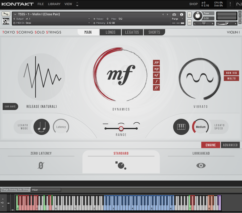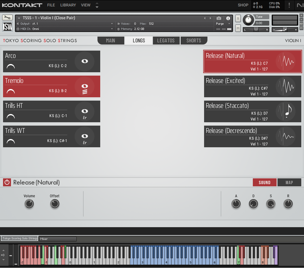 上部の”LONGS”, “LEGATOS” ,”SHORTS” タブではキースイッチに割り当てられた各奏法の調整や、マッピングの変更が可能。こちらは後述するTotal Articulation Control Technologyの機能が含まれています。
