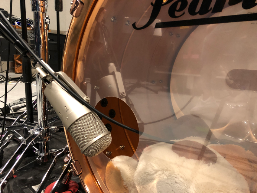バスドラには、ノイマンU47とエレクトロボイスND868を立てています。FOHのコンソールには、この2本を立ち上げてU47をメインで使っています、もし本番中に問題が起こった時はND868を使います。メンバーにモニターで返すのは、ND868のみ使用します。使用した結果は、ドラマーのバスドラの表現(強弱など)がピックアップ出来てとても良かったです。