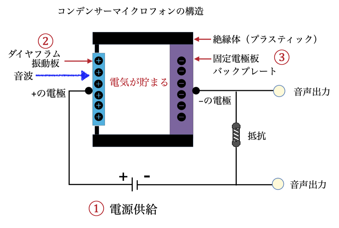 コンデンサーマイクロフォンの名前の由来は、電子部品のパーツのコンデンサー(キャパシターとも呼ぶ)のようにダイヤフラム(可変電極)とバックプレート(固定電極板)に電圧を与えて、電荷を貯めるのでそのように呼ばれています。
