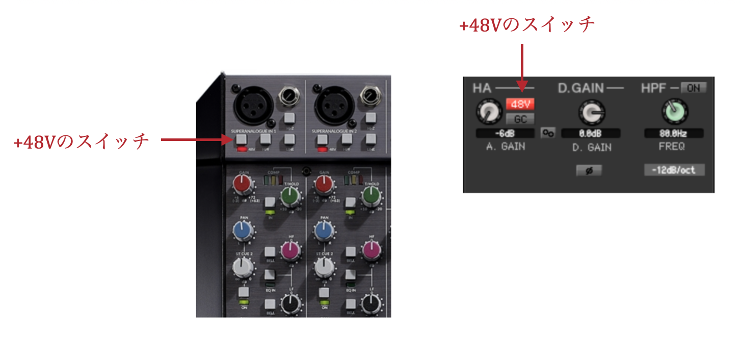 電源供給+48Vは、ファンタム電源と表現されます。ファンタムとは「幻影」「幽霊」「亡霊」の意味があります。何故、”ファンタム”と表現されるのかというと、マイクケーブルを通して電源を供給するため、電源の配線が見えないことからきています。上の図の+48Vのスイッチを押すと赤くインジケートされそのマイクロフォンが接続された回線に+48Vを供給します。