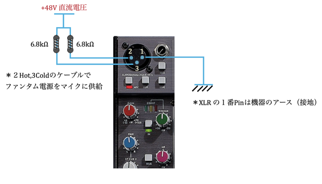 2 Hot,3 ColdのXLRのピンより直流+48V電圧が供給されます。もし、間違ってダイナミックマイクロフォン(バランス型の)にファンタム電源を送っても2 Hot,3 Cold電圧が正確に等しいため影響はありません。ファンタム電源は電流制限回路を備えており、ショートしたり誤配線されたりした場合もダイナミックマイクロフォンの損傷を防ぎます。