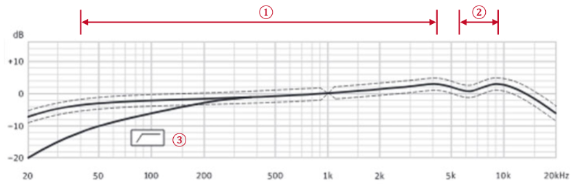 ②の6KHz周辺にディップ(へこみ)はありますが、気にならない程度です。ボーカル録音ではこの6KHz周辺にディップが良い結果になると思います。