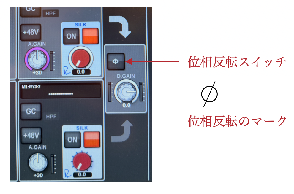 各社コンソールには、各インプットチャンネルに位相反転スイッチがありますので、バウンダリーマイクロフォンとバスドラの外に立てたマイクのミキシングタイミングで、バウンダリーマイクロフォンの位相スイッチを反転してください。