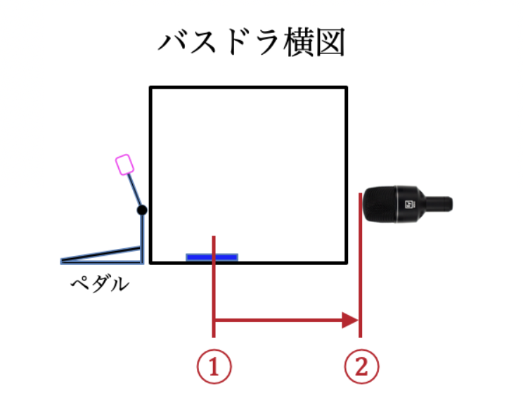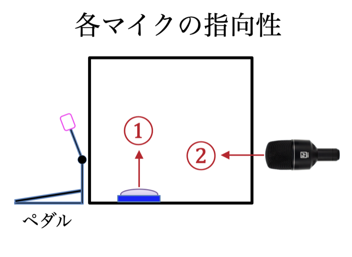 ②のマイクロフォンは、単一指向性でバスドラのペダルに向かって正面になります。