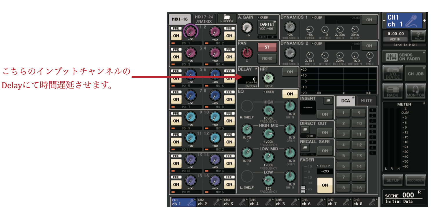 前回と重複しますが、まず①のバウンダリーマイクロフォンと、②のバスドラの外のマイクロフォンの時間を合わせます。①のバウンダリーマイクロフォンのコンソールチャンネルでインプットディレイを遅らせます。