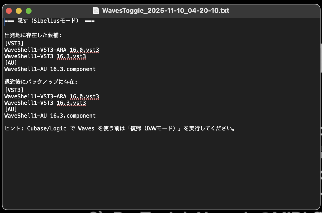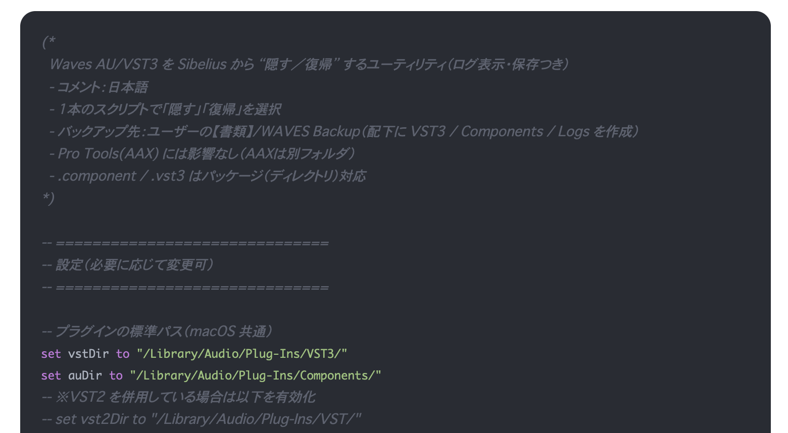 そして、譜面の作業が終わったらまたNuendoやLogic Xの作業に戻ることもよくあるので、上の手順で移動させたWAVESのプラグインをまた元の場所に戻すスクリプトも必要ですね。