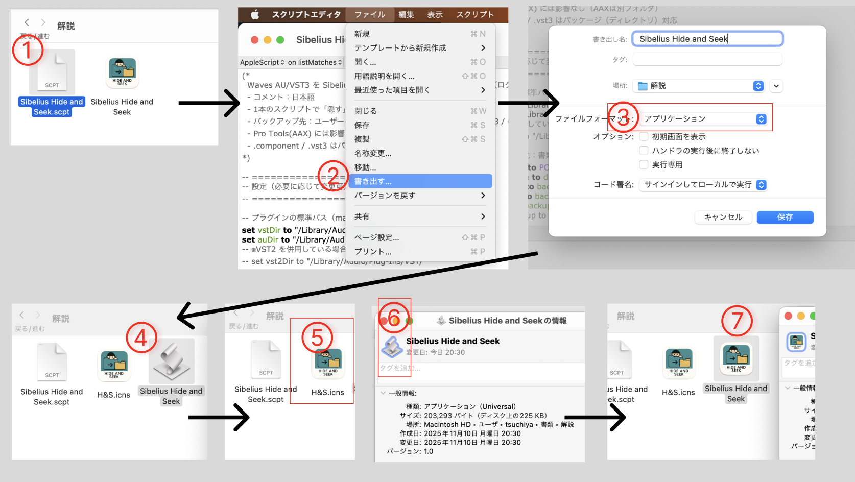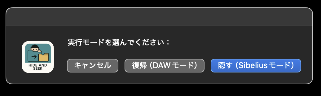 二つのスクリプトの結合とlogの書き出しのプログラム、それから日本語のコメントアウトはChatGPTに手伝ってもらいました。いい時代ですね!Hide and Seekというこのスクリプトをapp形式で保存して、MacのDockの中でSibeliusの横に置いておけばさくっと使えると思います。よかったらアイコンも作ったので使ってください!