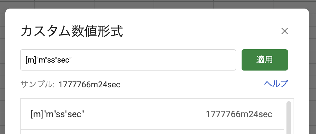 BとC列はタイムコードなのでこのままの表示で良いとして、D列のデュレーションは僕ら作曲家にとってはもう少し把握しやすい表示の方がいいので、D列全体を選択して、表示形式/数字/カスタム数値形式を選択して以下の通り入力します。