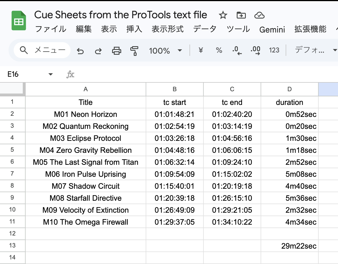 では続き。D13辺りにfx(ファンクション)を入れてCueの合計分数秒数を見やすくします。