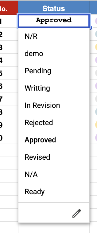 B5からB14はスポッティングが終わったトラックに対して作業が現状どういう状態かを表示してます。demoが選択されていれば書き始めてるという意味ですね。他にIn Revisionで改訂中とか監督にオッケーもらったらApprovedになります。