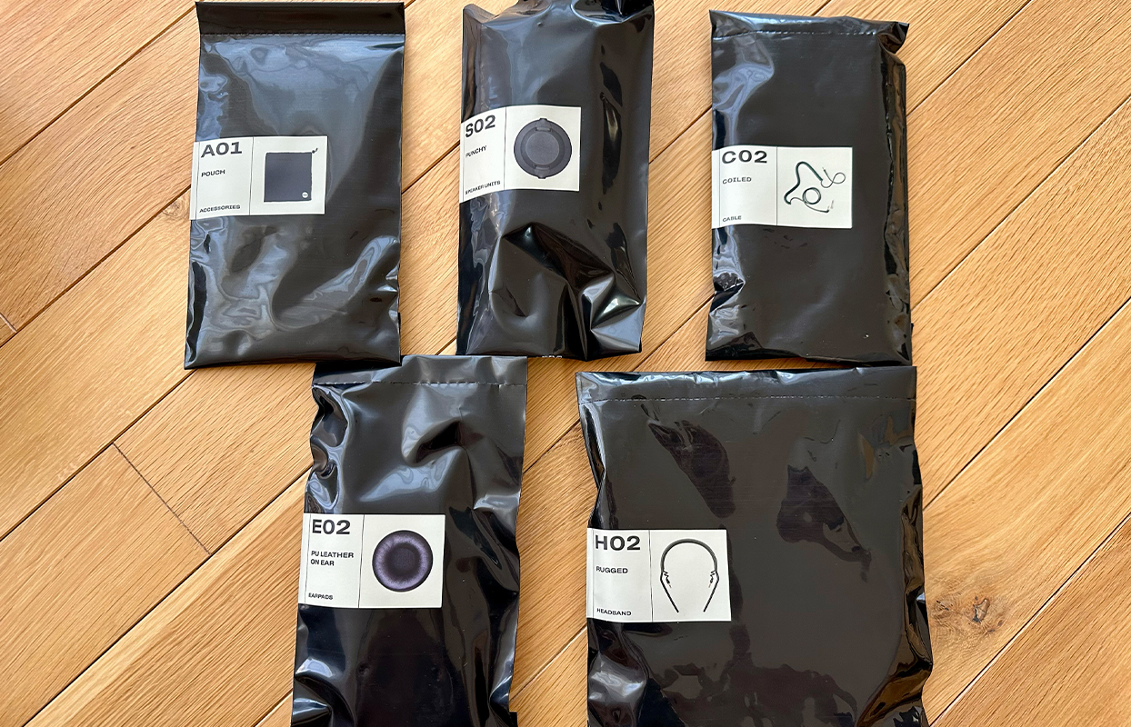箱の中には5個の袋が入っており、それぞれにパーツが入っています。そのうち1つはポーチなのでヘッドホン自体はたった4つのパーツで出来ています。なんというシンプルさ!イヤーパッド、ヘッドバンド、ケーブルはもちろん、スピーカーユニットまでもが交換可能なんです。
