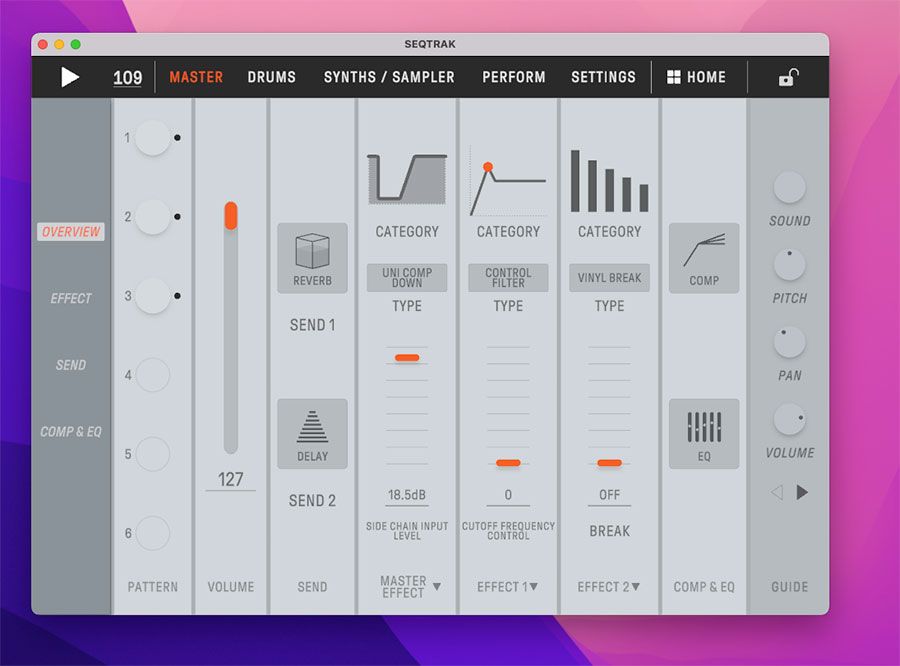 エフェクト部分が充実しているのもSEQTRAKの特徴です。トラックエフェクト・センドエフェクト・マスターエフェクトの3種類で構成されていて、エフェクトのパラメーターは、タッチスライダーで調整できます。(SEQTRAKアプリを使用すると、より細かく設定できます。)