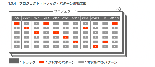 SEQTRAKは1曲のデータを「プロジェクト」という単位で管理します。本体に8つ保存でき、そのうち1つを使用します。プロジェクトは11のトラックで構成され、各トラックに最大6つのパターンを作成できます(プロジェクトにはテンポや各トラックのボリュームといった設定や状態も含まれます)
