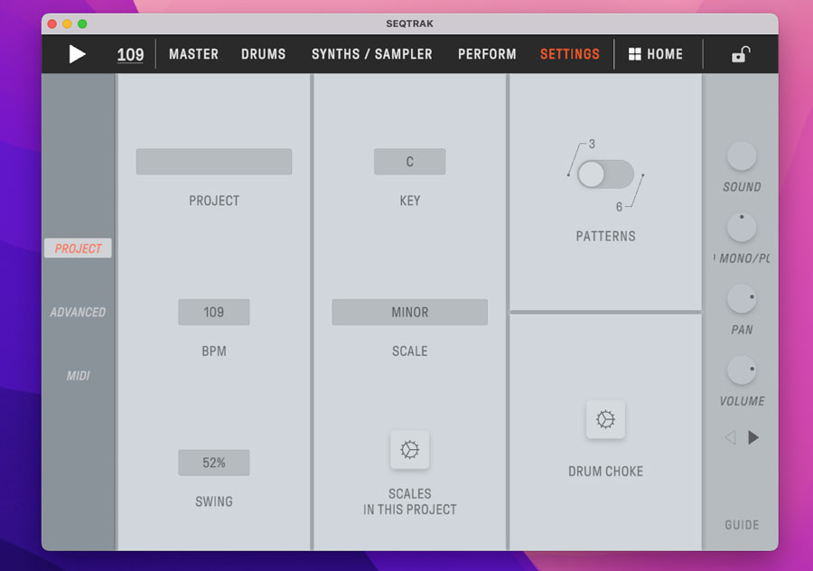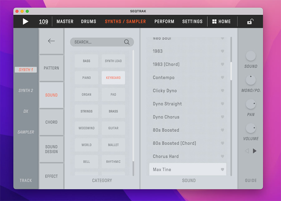 SEQTRAKはDrums、Synth & Sampler、Sound Design & Effectsと、大きく3パートに分かれたユーザーインターフェースとなっていて、ハンズオンスタイルのリアルタイムコントローラーが瞬間的なサウンドスケッチを可能としています。ほかに外観については音色を表示したりシーケンストラックを表示する液晶ディスプレイがないことに気づきます。その分デザイン性に優れているのですが、慣れるまでは音楽制作の状況が把握しづらかったりします。そこで重宝するのがアプリでの作業になります。