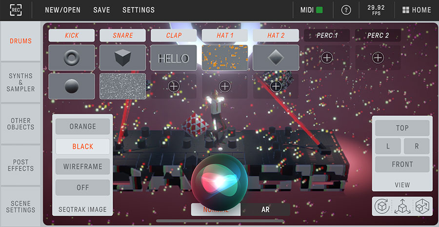 ここも従来のシーケンサーと大きく違うところだと思わせるVISUALIZER。アプリと連動させて使うのですが、魅力的な視覚体験を可能とするビジュアライザーが搭載されています。直接音楽制作の機能とは関係ありませんが、作動画投稿などが当たり前の今の時代、どんな機能で音と映像がリンクしていくのか気になります!そこで作った音にVISUALIZERの機能を試してみました。