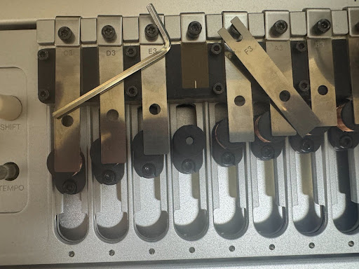 つまりCメジャースケールの1オクターブ分が装着されています。ピアノ黒鍵部分の♯や♭レゾネーターも付属しており、付属の六角レンチで交換することでCメジャー以外の調性にも対応可能です。