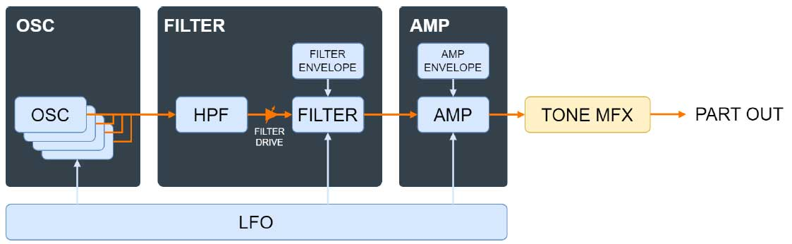 オシレーター、フィルター、アンプ、LFO、マスターエフェクトでシンセパートを構成し、このシンセパート部を独立して4系統搭載、リズムパートと合わせて5トラックのグルーヴマシンとしてバラエティ豊かなトラックを生み出します。
